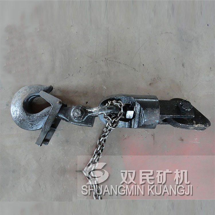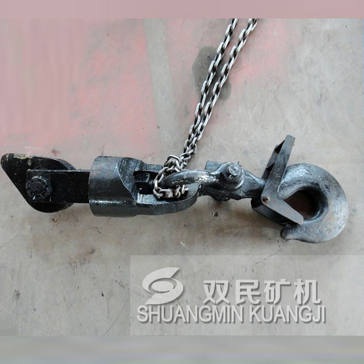 鉤頭及連接裝置,簡稱為鉤頭裝置。 該產(chǎn)品結(jié)構(gòu)簡單,使用性能單一。零件全部由鍛件加工而成,鋼絲繩連接采用了兩種型式,其中5t、7t采用不偏心護(hù)繩環(huán),板卡連接;9