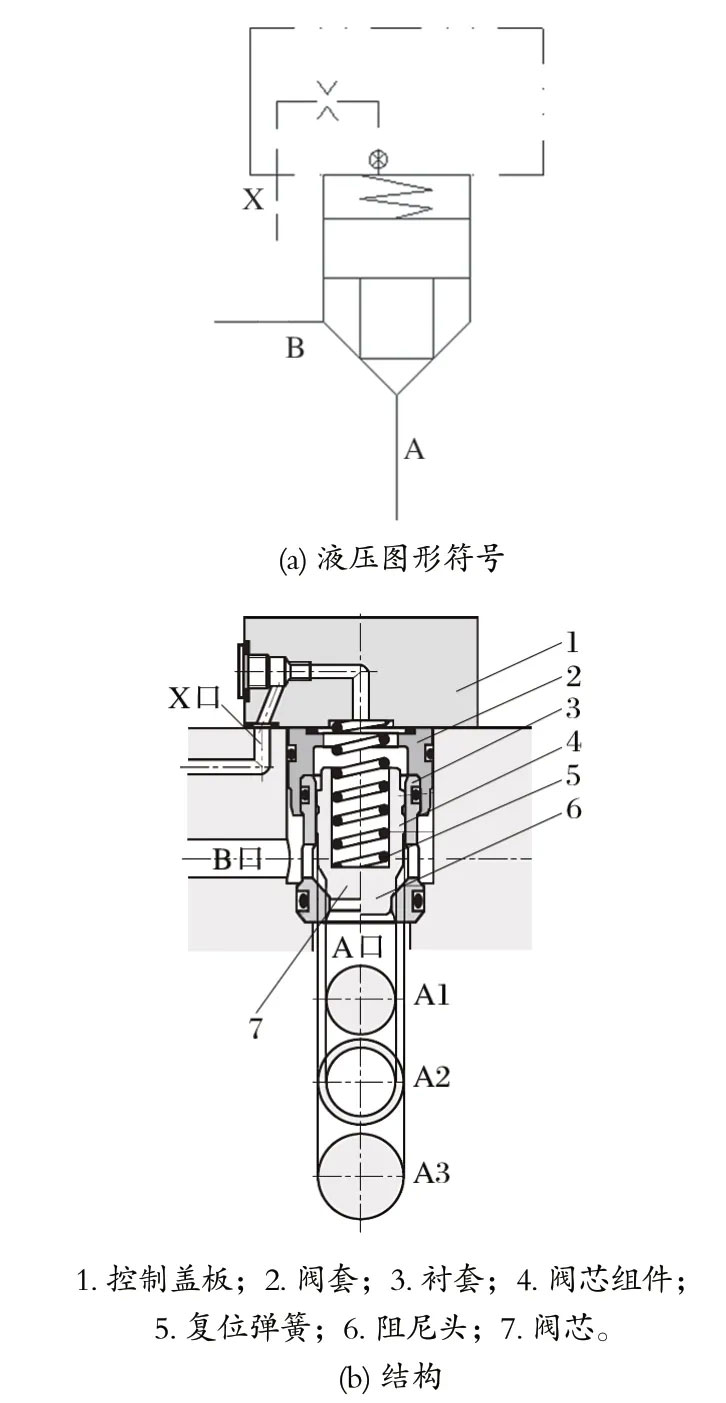 3.1 二通插裝閥 二通插裝閥由插裝組件、控制蓋板等組成。插裝組件安裝于油路塊中符合 ISO 7368 的標準安裝孔中,并用控制蓋板封嚴。通過插裝組件,控制蓋板和其他附件的組合可以實現(xiàn)需要的控制功能。二通插裝閥具有流動阻力小、通流能力大、動作速度快、抗污染能力強、工作可靠、結(jié)構(gòu)簡單、易于實現(xiàn)元件和系統(tǒng)的“三化”、簡化系統(tǒng)等優(yōu)點。