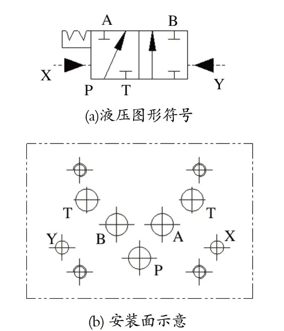 雙泵液壓站上使用的板式液動換向閥安裝在閥組油路塊上,通過油路塊上設(shè)計的油孔及螺釘安裝孔進行連接。圖2 所示為 23Y 型板式液動換向閥,其安裝面上油口眾多。當然,進口廠家也有板式液動換向閥可供選擇,但是其安裝面上同樣油口眾多。美國PARKER 的 D3DP26D2N 板式液動換向閥如圖3 所示,該換向閥在雙泵液壓站上也有使用。A 口、B 口和 P 口為閥的工作油口,X 口和 Y 口為控制油口。安裝面上油口眾多,這給閥組油路塊的油孔設(shè)計增加了難度。此外,板式液動換向閥還存在閥芯容易卡阻、彈簧使用壽命短等問題,這都是制動系統(tǒng)運行中存在的安全隱患。