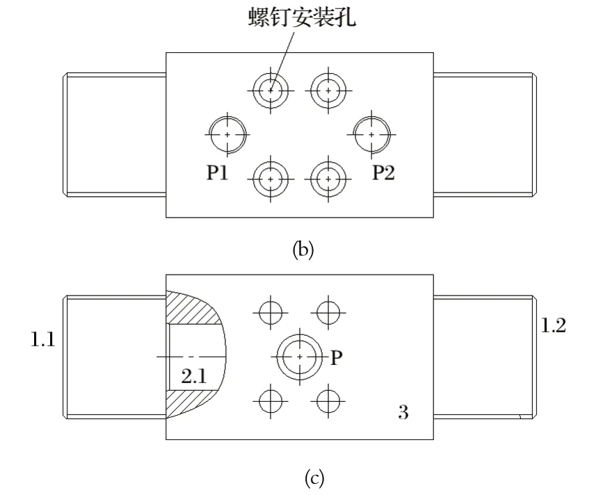 (2) 將兩個插裝閥組合設(shè)計成一個獨(dú)立的液動換向閥,再安裝到閥組油路塊上。如圖6 所示,獨(dú)立的液動換向閥包含一個獨(dú)立的閥體 3,兩端分別安裝有一個插裝組件 2 和一個控制蓋板 1;閥體內(nèi)部設(shè)計有油孔,用于連接兩端的插裝閥;閥體外側(cè)安裝面上設(shè)計有兩個進(jìn)油孔 P1 和 P2,通過管接頭連接兩個泵裝置;閥體內(nèi)側(cè)安裝面上設(shè)計有一個出油孔 P,閥組油路塊上只需要設(shè)計一個與出油孔 P 配套的供油孔即可;閥體上設(shè)計有螺釘安裝孔,用于將液動換向閥安裝在閥組油路塊上。