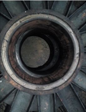 在天輪裝置軸瓦潤滑不良的情況下,天輪運轉(zhuǎn)時,軸瓦與天輪軸之間潤滑油膜形成受阻,兩者間由滑動潤滑變成了干摩擦,導(dǎo)致天輪產(chǎn)生異響;此時天輪軸與軸瓦之間因相對運轉(zhuǎn)形成的摩擦力由軸瓦與輪轂之間的固定螺栓承受,在長時間的正反轉(zhuǎn)運行和沖擊下,固定螺栓會逐漸被剪斷。剪斷之后如果未及時發(fā)現(xiàn)而繼續(xù)使用,剪斷的螺釘會在游動輪轂內(nèi)孔端面形成環(huán)形溝槽 (見圖 4),也會導(dǎo)致天輪產(chǎn)生異響。同時游動輪轂內(nèi)孔會因軸瓦與游動輪轂的相對運動而產(chǎn)生磨損。