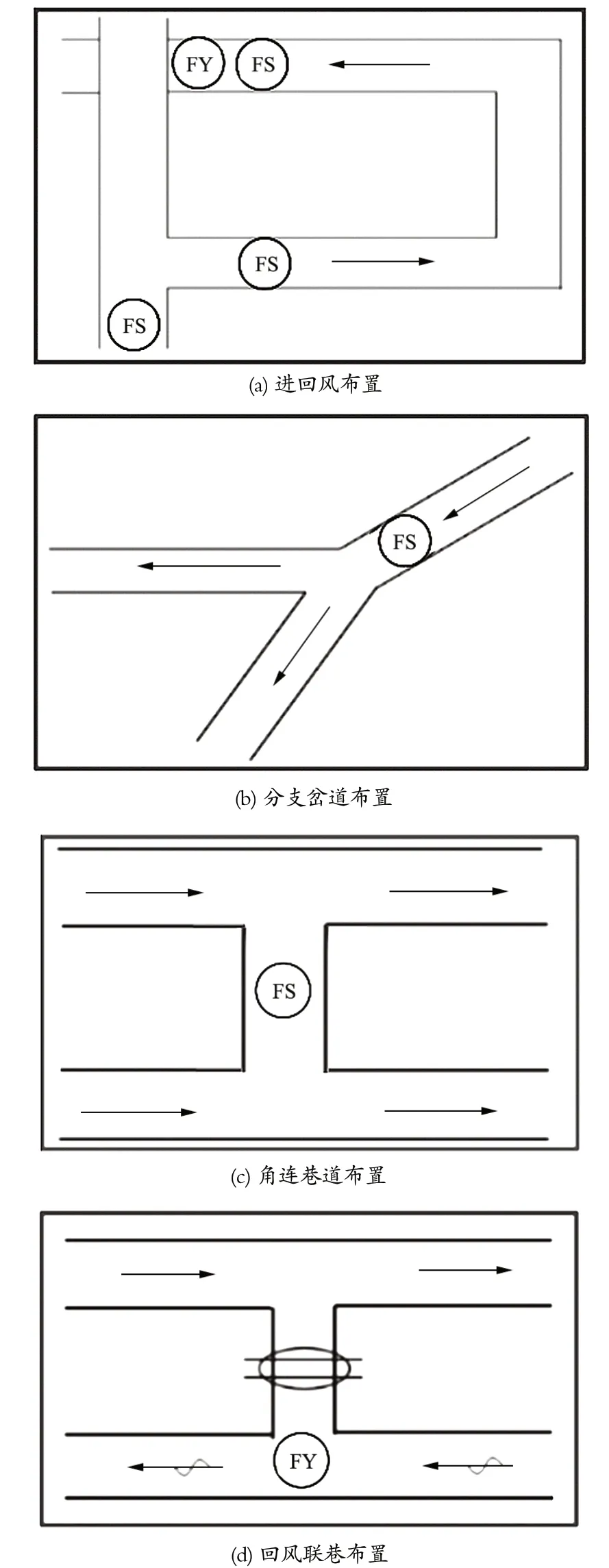 針對井下各地點作業(yè)內(nèi)容與通風(fēng)不同方式,尤其是在繞道車場、分支岔路巷道和聯(lián)絡(luò)巷等地點,需要安裝傳感器進(jìn)行監(jiān)測。此外,在 Y 形和 U 形通風(fēng)方式的采煤工作面回風(fēng)流側(cè)也容易出現(xiàn)風(fēng)流不穩(wěn)定現(xiàn)象;在主要運輸大巷、掘進(jìn)工作面設(shè)置有調(diào)節(jié)風(fēng)窗的風(fēng)門前后,由于運輸需要經(jīng)常開啟風(fēng)門,容易導(dǎo)致風(fēng)流擾動影響較大,產(chǎn)生局部風(fēng)速、風(fēng)壓變化。這些地點均需要安裝傳感器加強監(jiān)測。