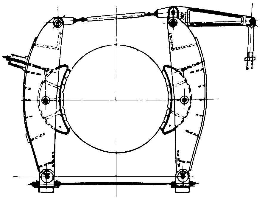 (3)綜合閘 早期國(guó)產(chǎn)的 JKA 型提升機(jī),舊角移式閘瓦存在磨損不均問題,其制動(dòng)系統(tǒng)的改造采用綜合閘(見圖 1),以減少閘瓦磨損,延長(zhǎng)閘瓦使用壽命。
