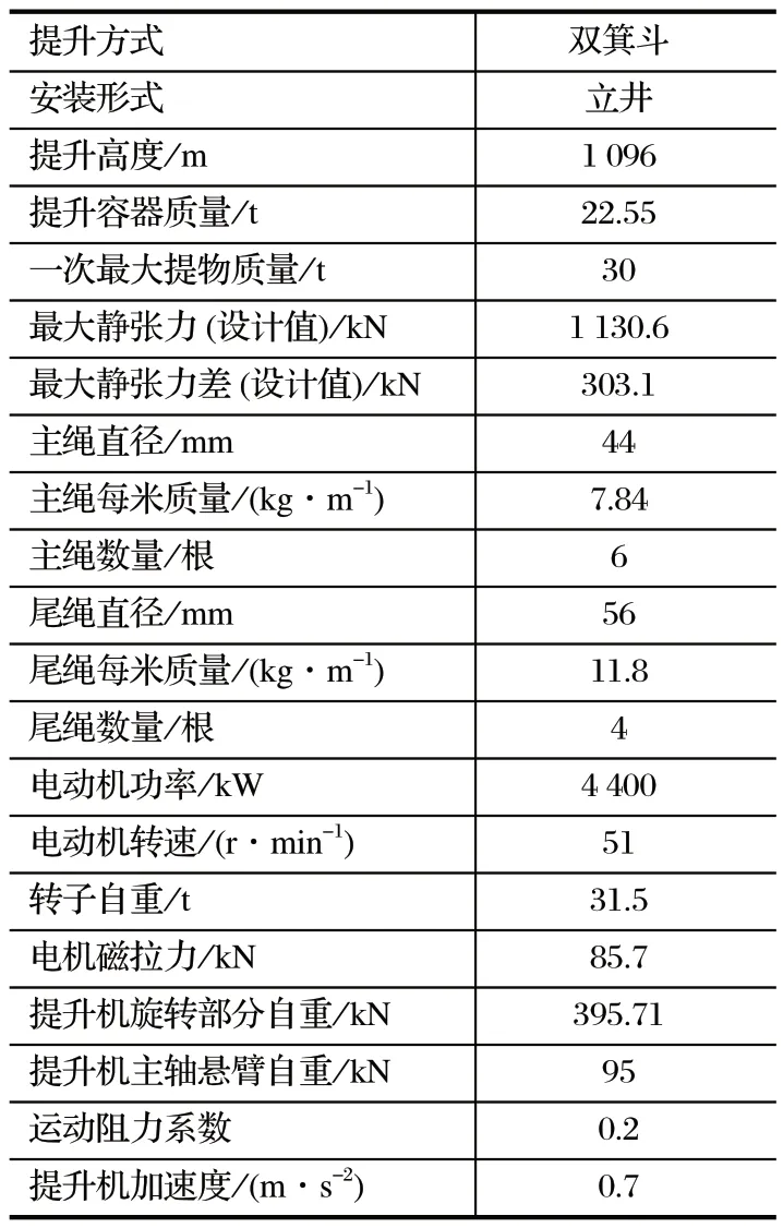 本研究以某礦 JKM-4.5×6PⅢ多繩摩擦式提升機(jī)為例,該提升機(jī)由中信重工機(jī)械股份有限公司設(shè)計(jì)制造,其系統(tǒng)參數(shù)如表1 所列。主軸傳動(dòng)側(cè)采用 FAG雙列調(diào)心滾子軸承,軸承型號為 240/1060BK30.MB(FAG),軸承當(dāng)量動(dòng)載荷 Cr=18 600 kN,e =0.27,Y=2.47。