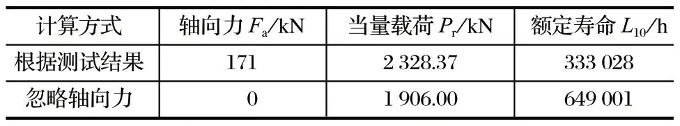 4.3 計(jì)算結(jié)果與測試結(jié)果對比 根據(jù)傳統(tǒng)方法得到軸向力為 0 kN,測試方法得到軸向力為 171 kN。按照軸承壽命計(jì)算公式,利用兩方法分別計(jì)算,其結(jié)果如表2 所列。