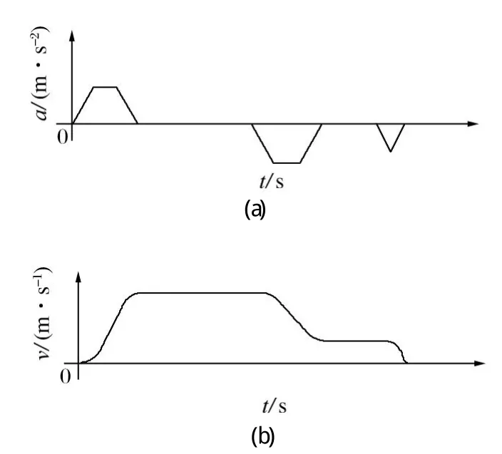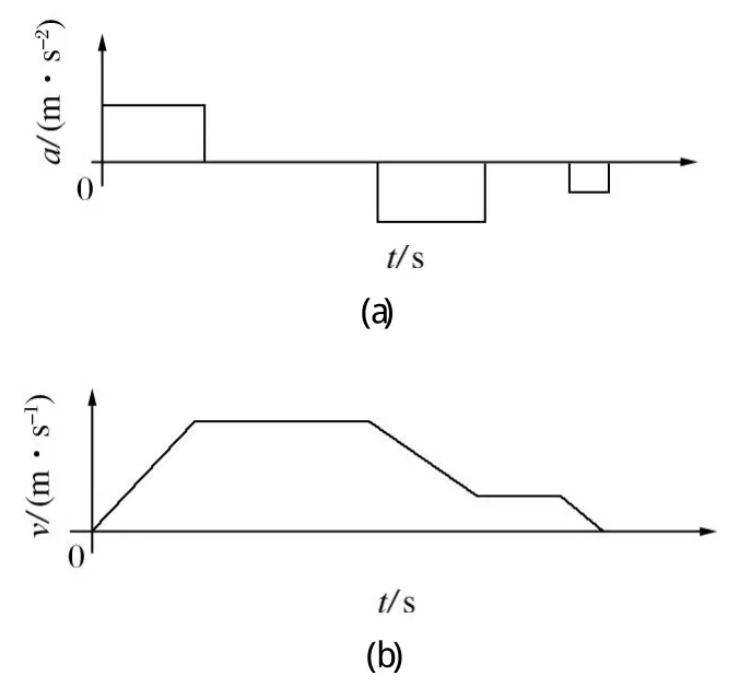 (4)重視提升系統(tǒng)沖擊限制,常用的有矩形加/減速度控制和梯形加/減速度控制,分別如圖1、2所示。采用梯形加/減速度控制曲線,并且加/減速度的變化率不宜大于 0.3 m/s3,以減少加/減速過(guò)程中提升鋼絲繩所受的動(dòng)張力及彈性振動(dòng)。新建礦井尤其是深井提升系統(tǒng)宜采用恒減速制動(dòng),可有效控制緊急制動(dòng)過(guò)程中提升鋼絲繩的動(dòng)張力,同時(shí)避免提升鋼絲繩打滑現(xiàn)象。