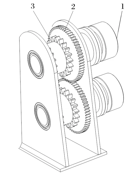 針對雙液壓馬達(dá)在工作過程中出現(xiàn)速度不同步問題,在連接鏈輪的軸上加裝一對同步齒輪,使兩個鏈輪速度強(qiáng)制同步。送繩機(jī)構(gòu)的局部結(jié)構(gòu)如圖2所示。